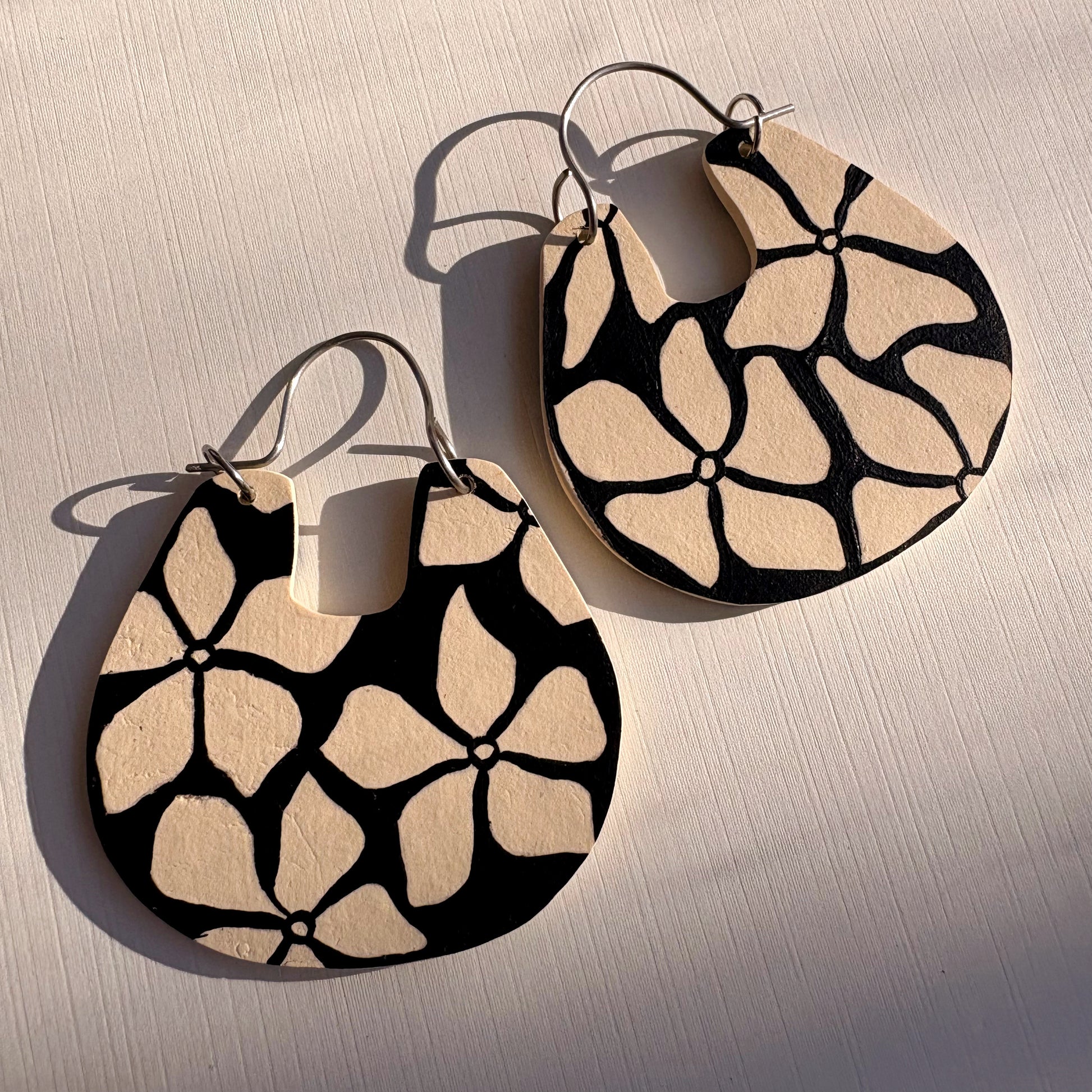There hand painted wonky flower hoops are double sided. One side features hand painted black flowers and the other side features cream flowers with a black background. Both sticking and unique.