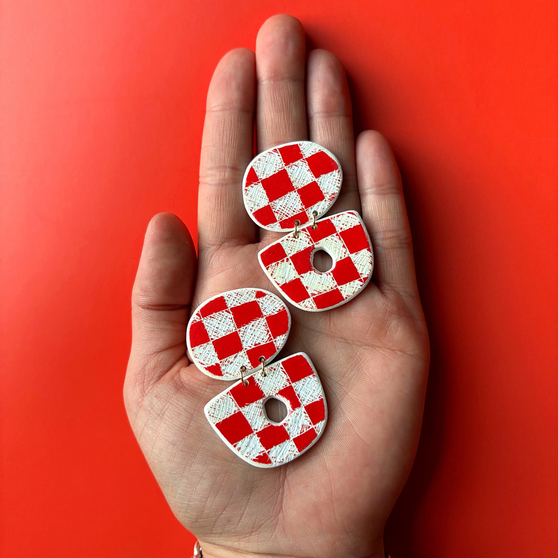 These cutie 1.5” vibrant red hand carved checkies are a fun pop of color in our fav checkered print!