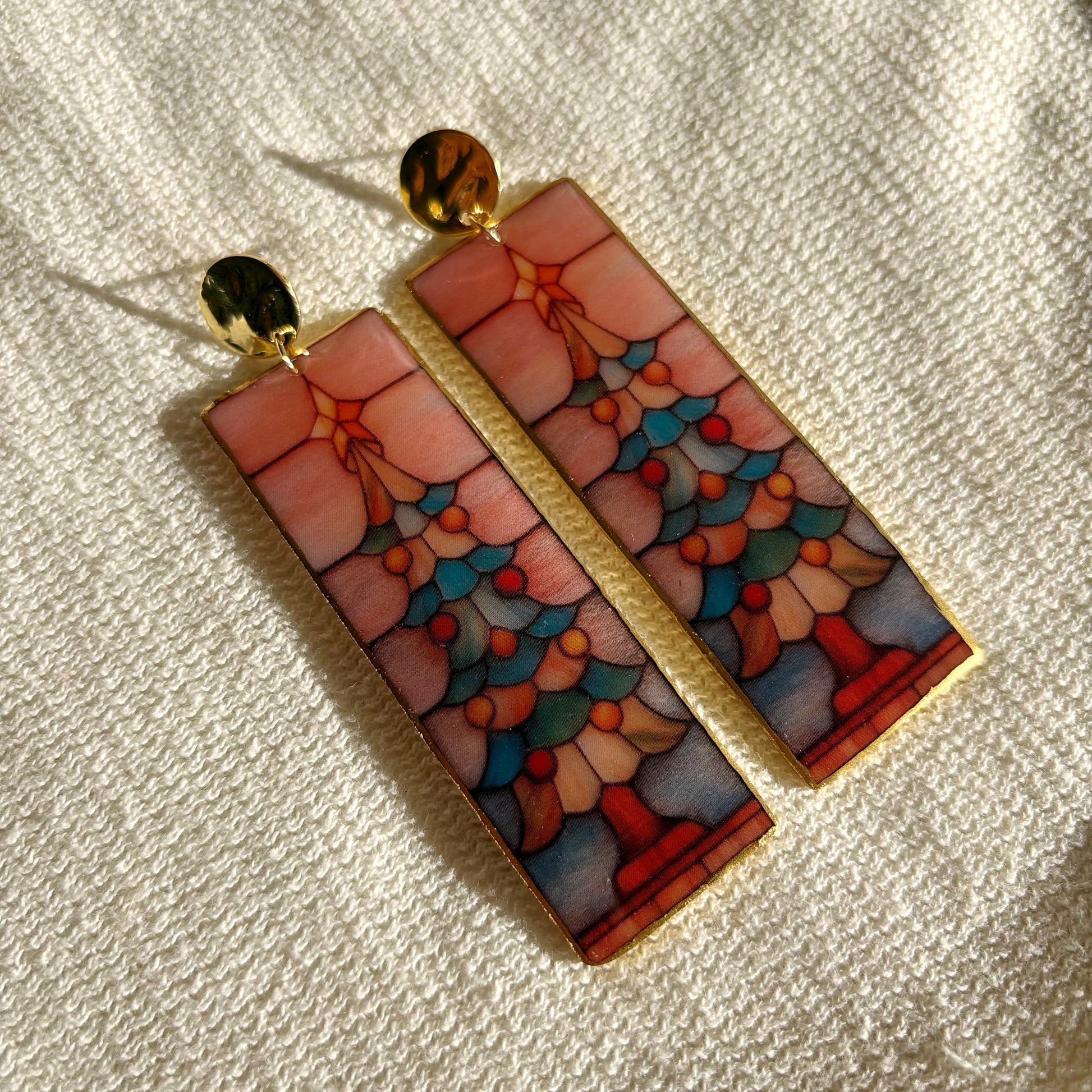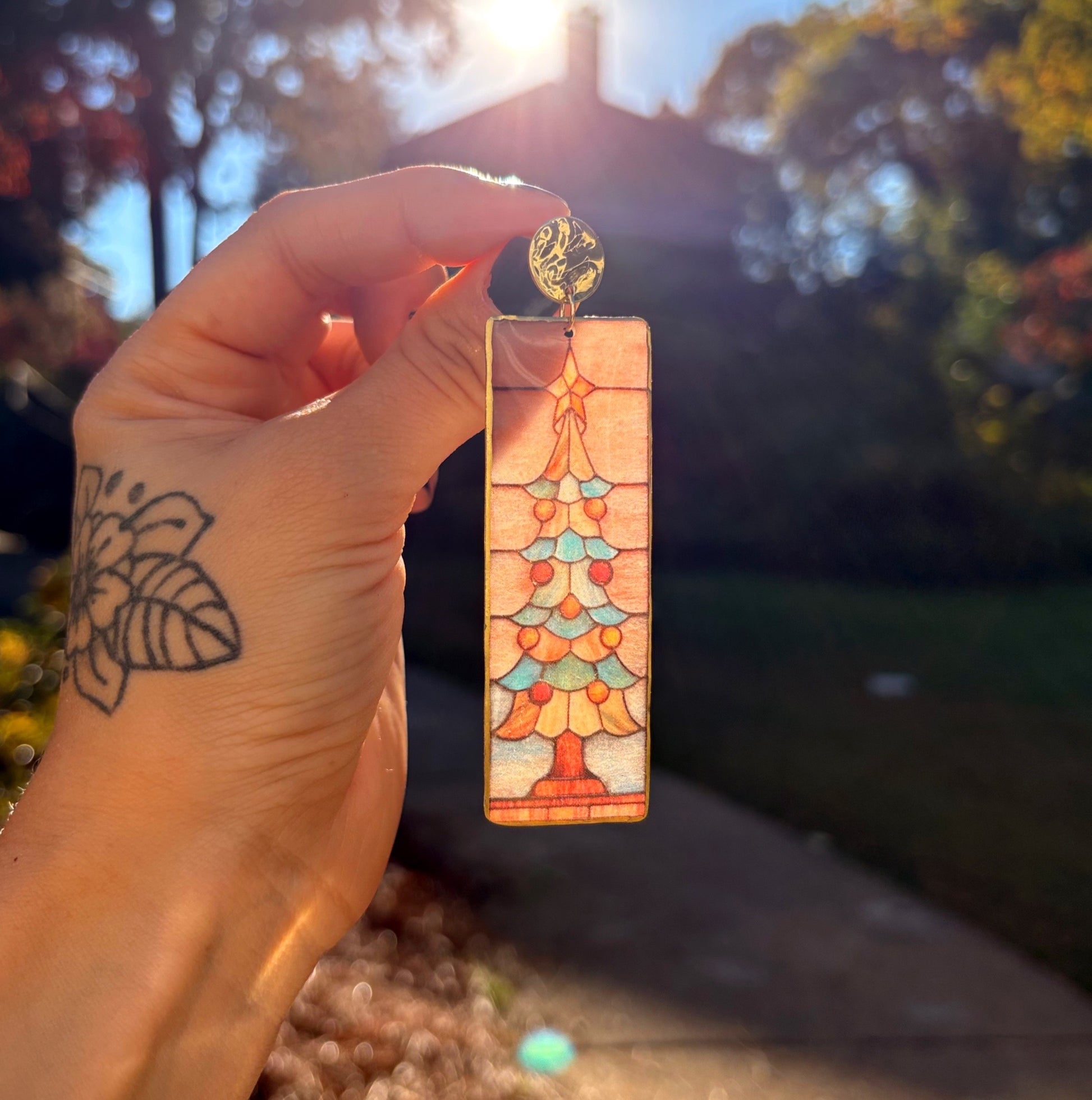 These vintage inspired Rosey pink stained glass style earrings feature the cutest tree with big colorful ornaments! Add a little color to you holiday fits!