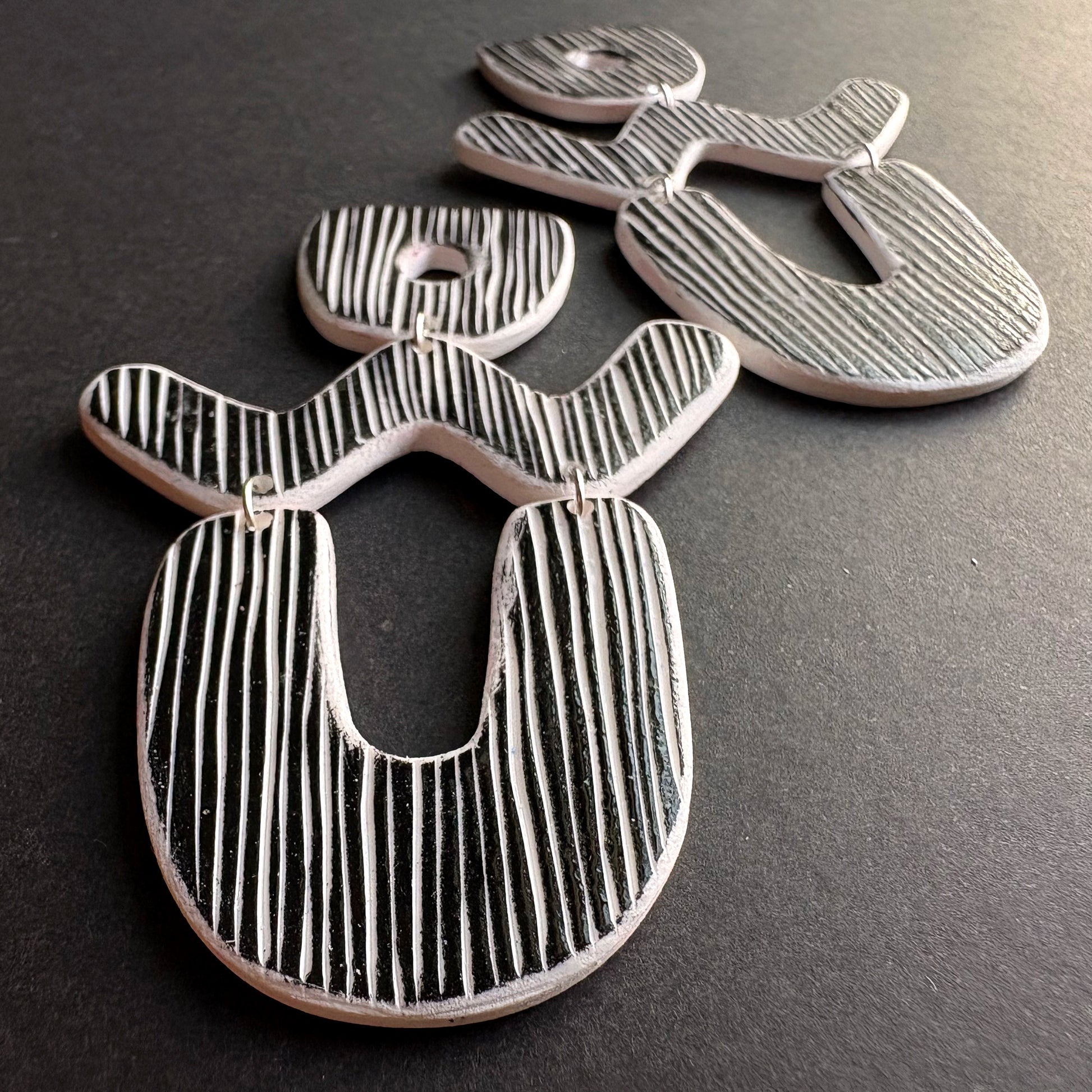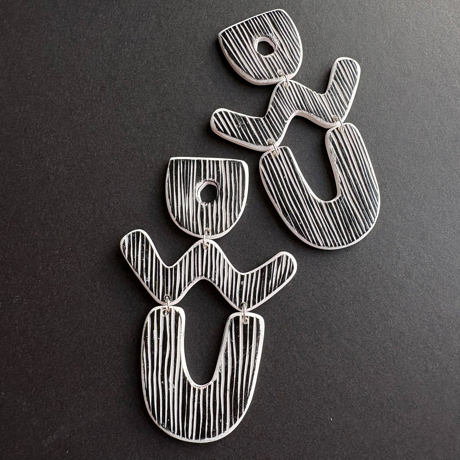 These fun abstract earrings measure about 3” long top to bottom and are full of eye catching appeal!